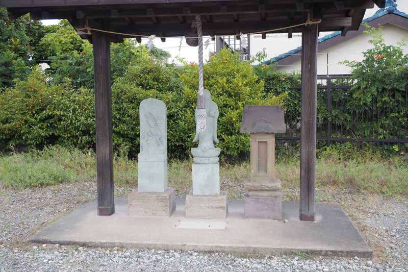 | ■子守神社~甘藷試作地 街道に戻って東進すると,●旧馬加宿の中心になる。両側が鍵の手になっているが、継場であっても、小規模な感じで、問屋があったこと以外は未詳という。ゆるく右カーブへすすみ、県道57号へ出て、左折。「京成幕張駅」方面に向かうと、左手、広い砂利の広場の中に、●左手の社殿が秋葉神社、右手の社殿が昆陽神社で、青木昆陽が祀られている。境内の覆屋の中に"子安観音など"、右側に"出羽山塔群 "などが祀られている。 昆陽神社の向かいに●「青木昆陽甘藷試作地」の案内板と石碑があり、千葉県指定史跡になっている。案内板には享保二十年(1735)この地で甘藷を試作し、飢饉を救った青木昆陽の業績が書かれています。 12:30 |