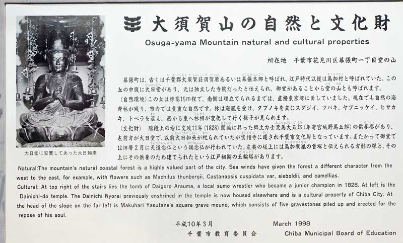 | ■幕張1C入口~下八坂橋 幕張陸橋をくぐった先、●左斜めに入るのが旧道で、曲がります。 500mほど進んだ左手に"庚申塔・石地蔵"がある。左右の庚申塔、地蔵は倒れて、草に埋まってしまっている。中央の笠付き庚申塔は、享保元年(1716)のもの。 そのすぐ先左手に"「大須賀山の自然と文化財」"という案内板がある。これによると、幕張町は、古くは、千葉郡大須賀荘須賀原あるいは幕張本郷と呼ばれ、江戸時代以後は馬加村(まくはりむら)と呼ばれていたという。 ●正面の石段を上ると、すぐ右手に文政11年(1828)関脇昇進した力士"荒馬大五郎(4代目年寄宮城野馬五郎)の供養塔"がある。 「首塚」の案内に従って奥に進み、左に上っていくと●馬加康胤(まくはりやすたね)の首塚と伝わる方形の塚と、その供養のために江戸時代初期の五輪塔が立っています。 11:32 |